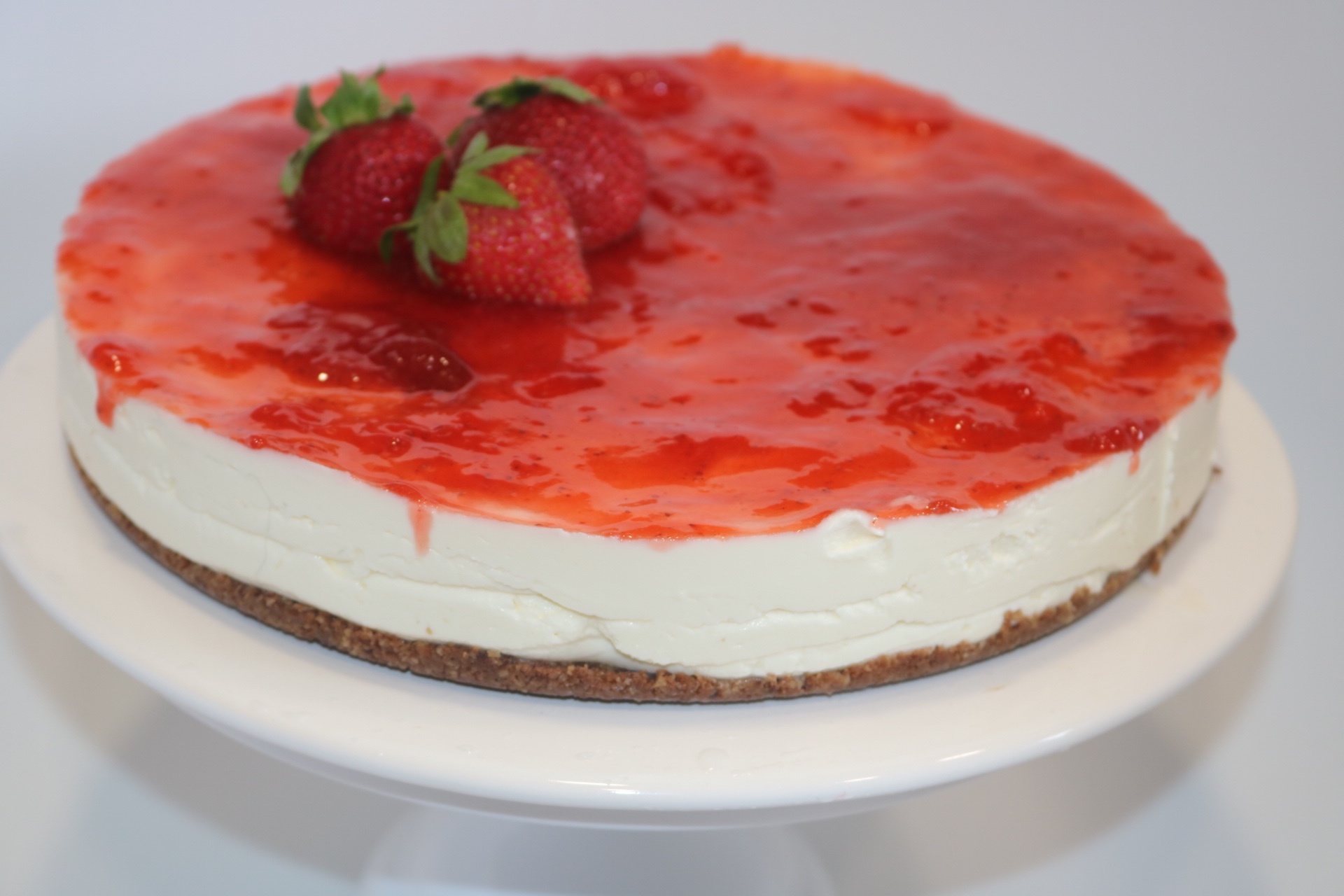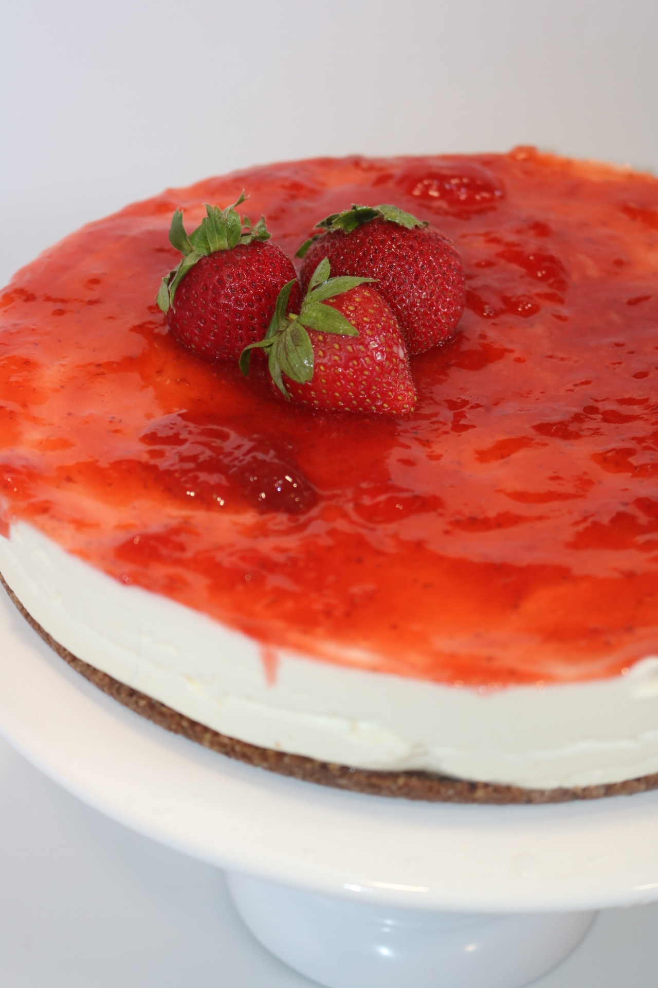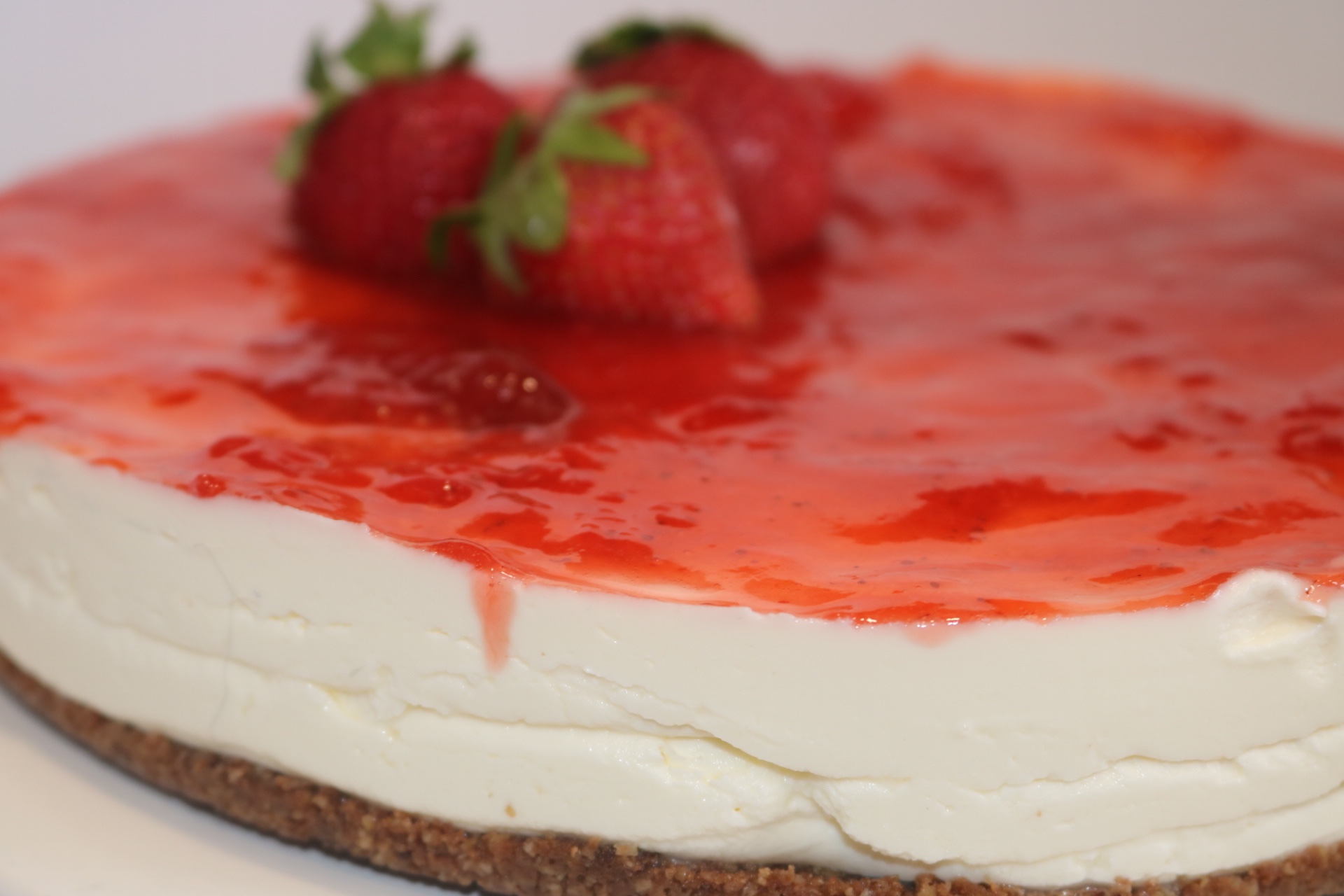 3. Una vez conseguida la mezcla para la tarta de queso fría, la echaremos en el molde que tenemos ya preparado con la base de galleta. Dejaremos enfriar en la nevera unas 3 horas aproximadamente y una vez cuajada la tarta de queso fría decoraremos la superficie de la tarta con nuestra cobertura preferida en este caso, mermelada de fresa. Yo utilicé confitura de fresas de Mercadona. Este 👇🏻
