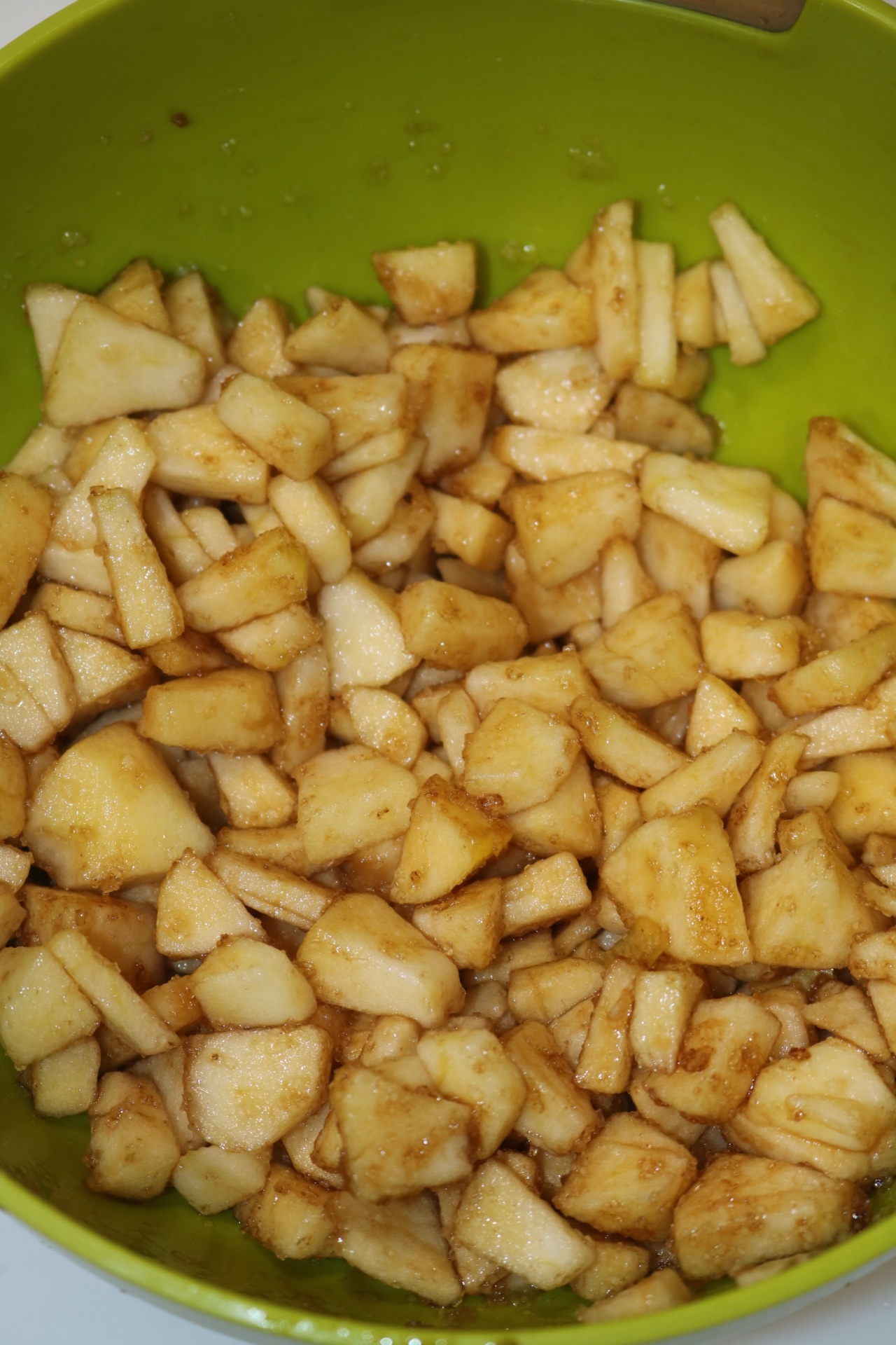 Empezamos cortando 3 de las 4 manzanas en daditos, vertemos las dos cucharadas de zumo de limón y 15 grs del azúcar Moreno. Tapamos con un papel film y reservamos.