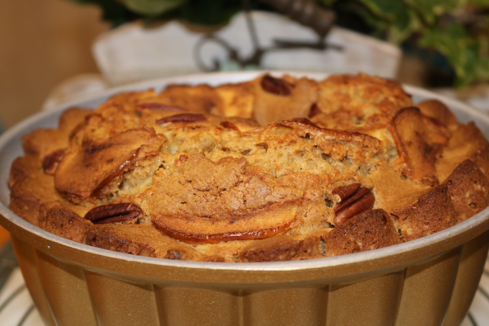 Podemos cortar unas láminas de manzana con un pelador de patatas, poner por encima de la mezcla y también unas cuantas nueces, ya veréis que bonito queda una vez horneado.