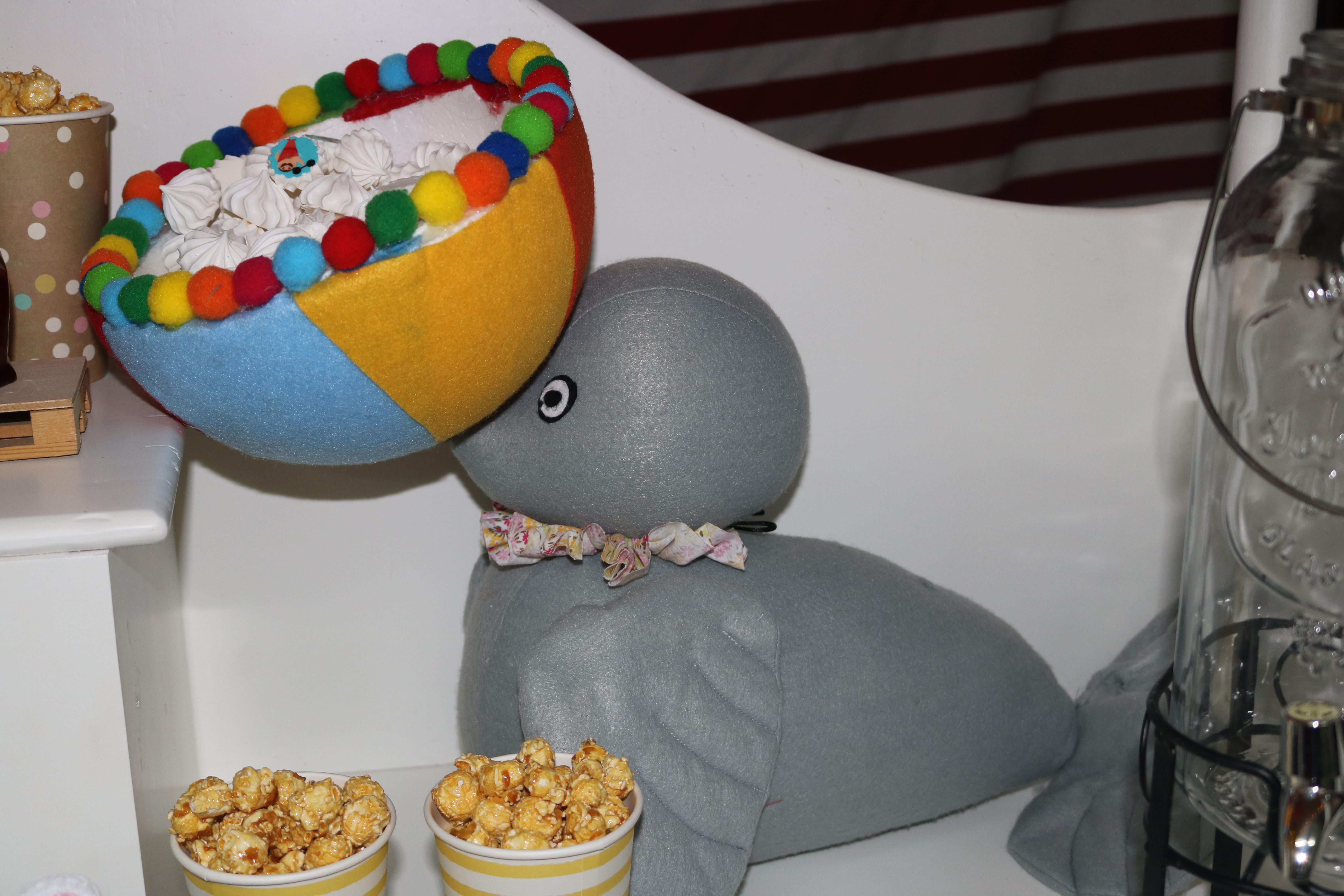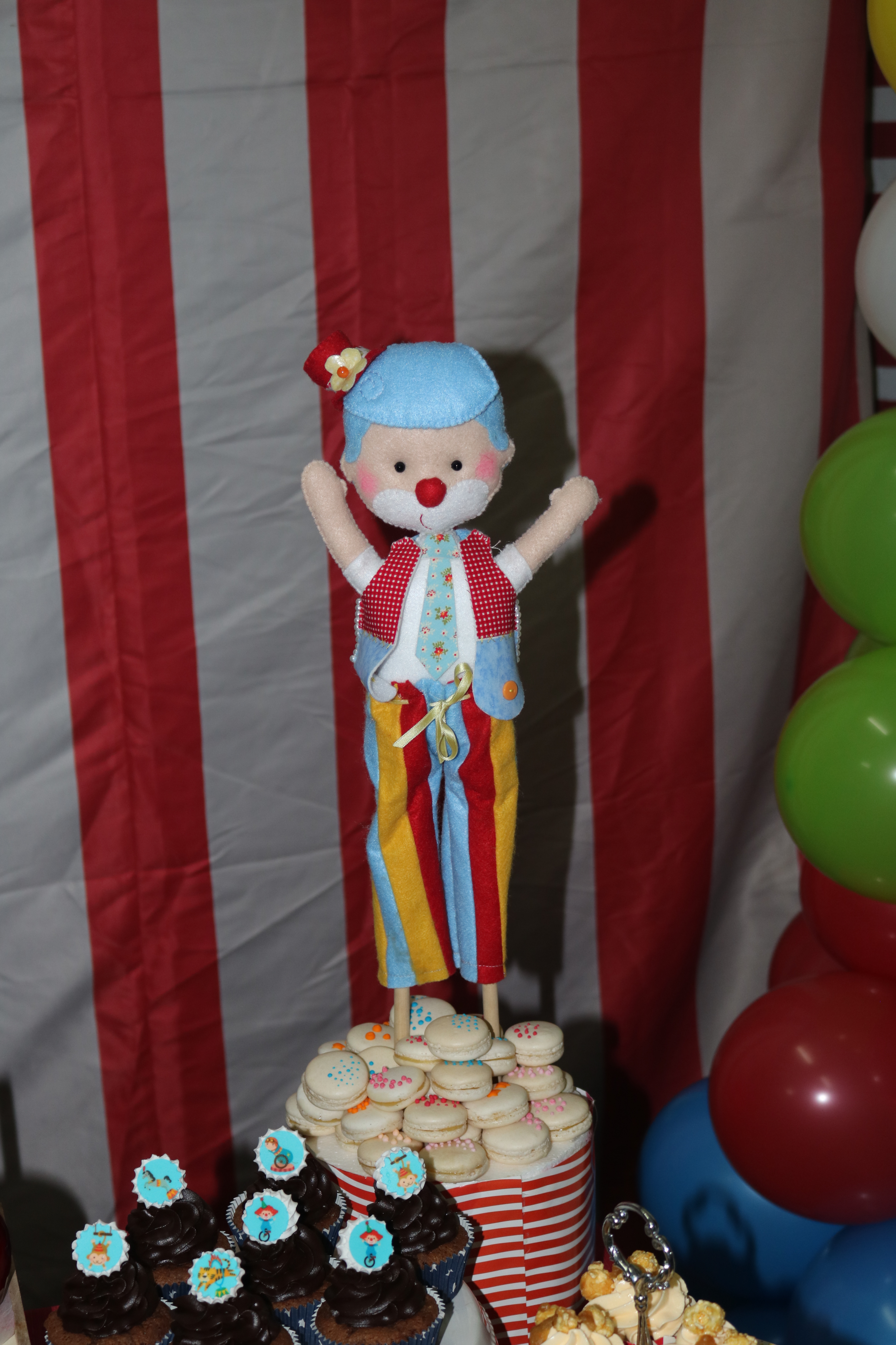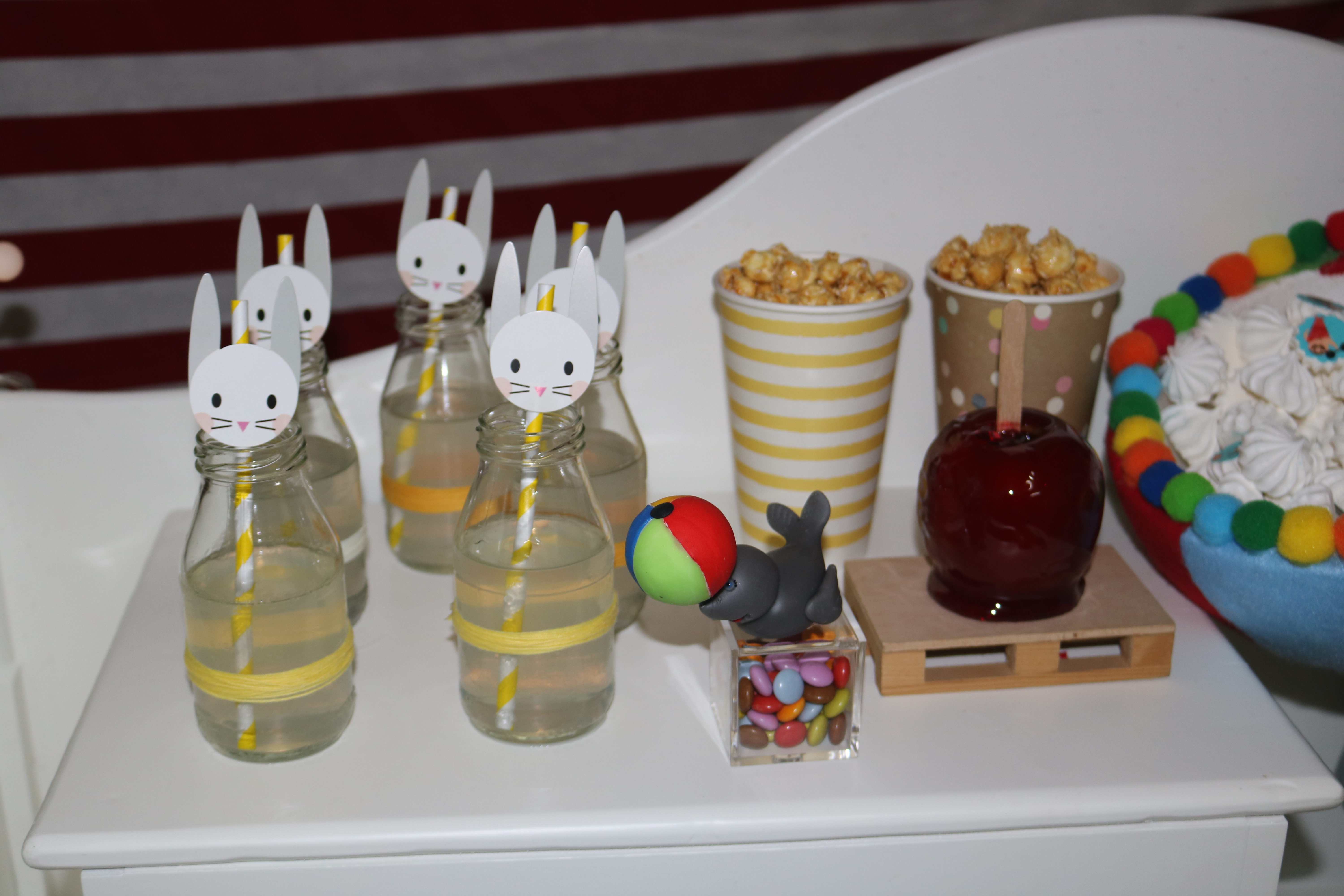 La mesa está compuesta por elementos decorativos hechos a mano, tambores, que, por cierto, cogí de caja de juguetes de mi hija, prestado claro, jaja. Conejitos porta chuches que salían de un gorro…¡Pura magia! Ocas malabaristas, una gigante que era la encargada de llevar los merenguitos y otras pequeñitas hechas con biscuit.