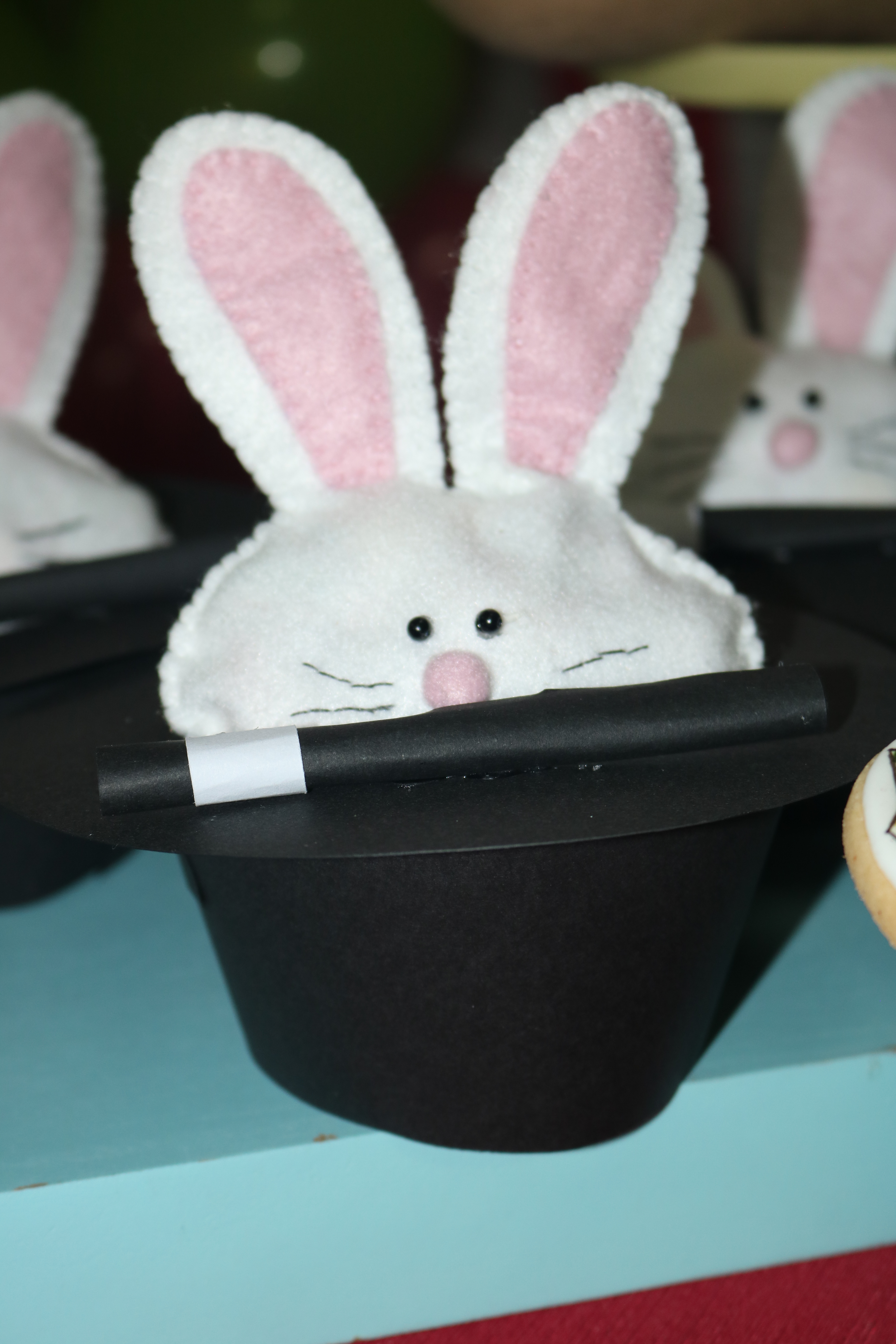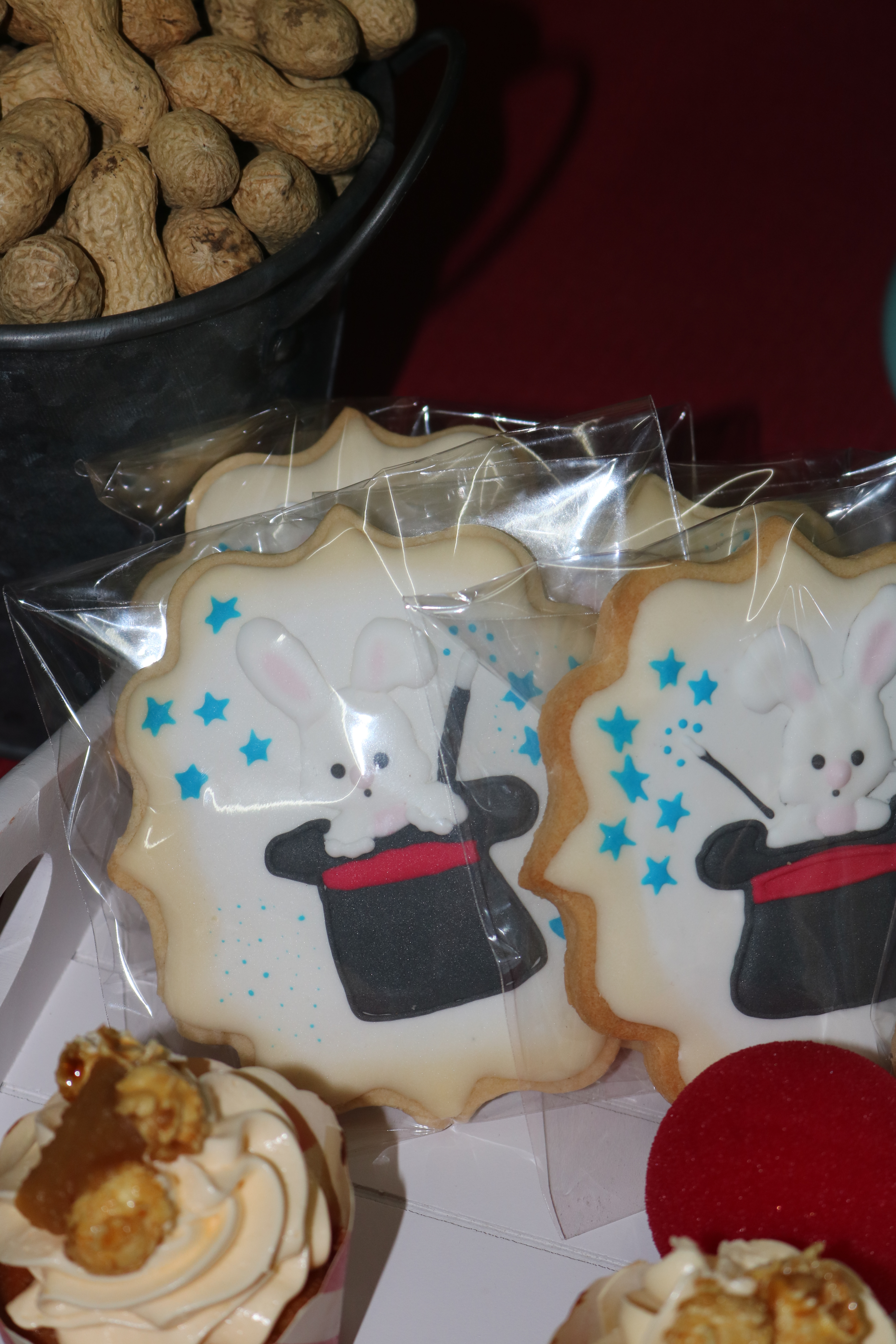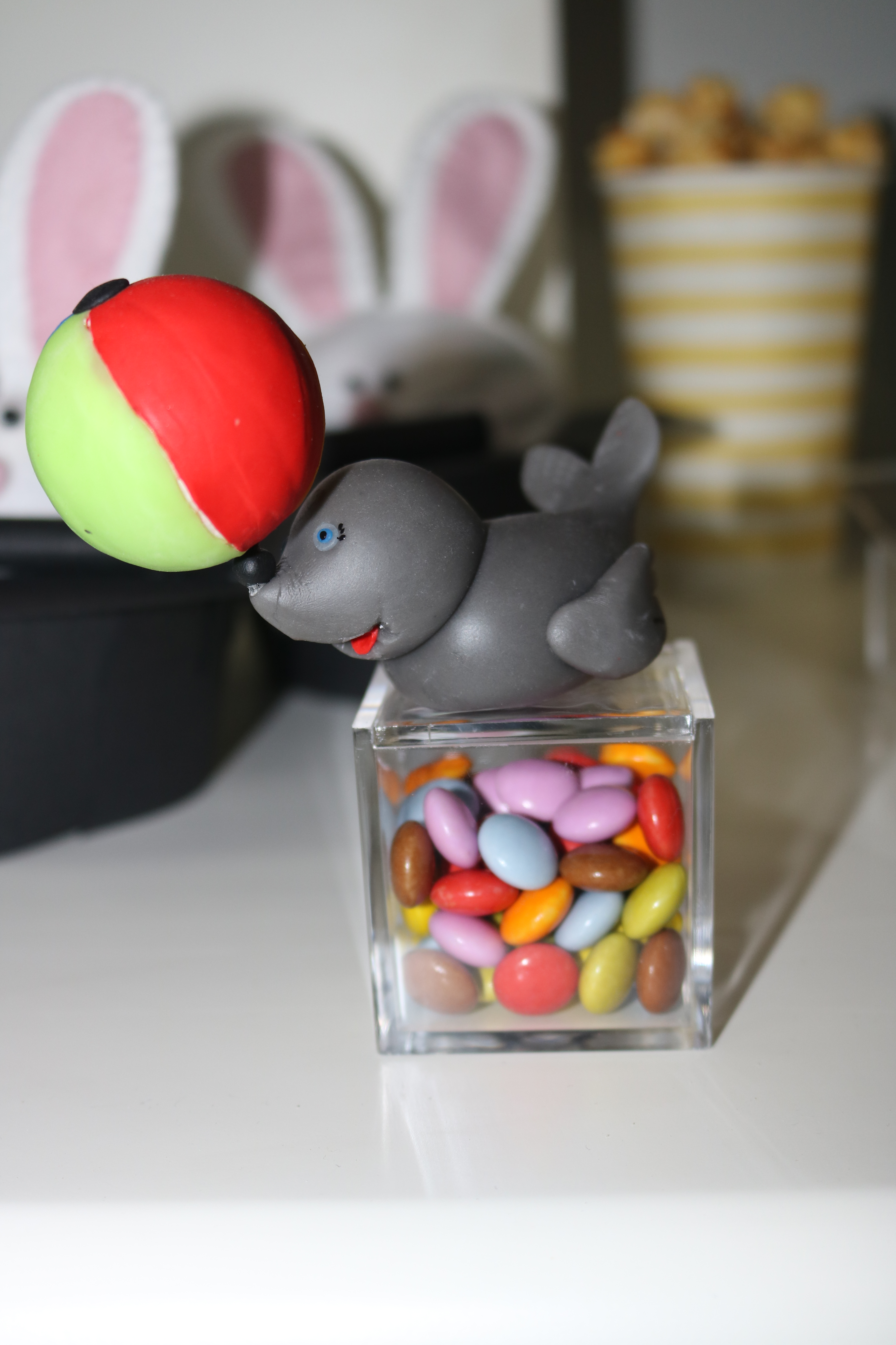 La mesa está compuesta por elementos decorativos hechos a mano, tambores, que, por cierto, cogí de caja de juguetes de mi hija, prestado claro, jaja. Conejitos porta chuches que salían de un gorro…¡Pura magia! Ocas malabaristas, una gigante que era la encargada de llevar los merenguitos y otras pequeñitas hechas con biscuit.