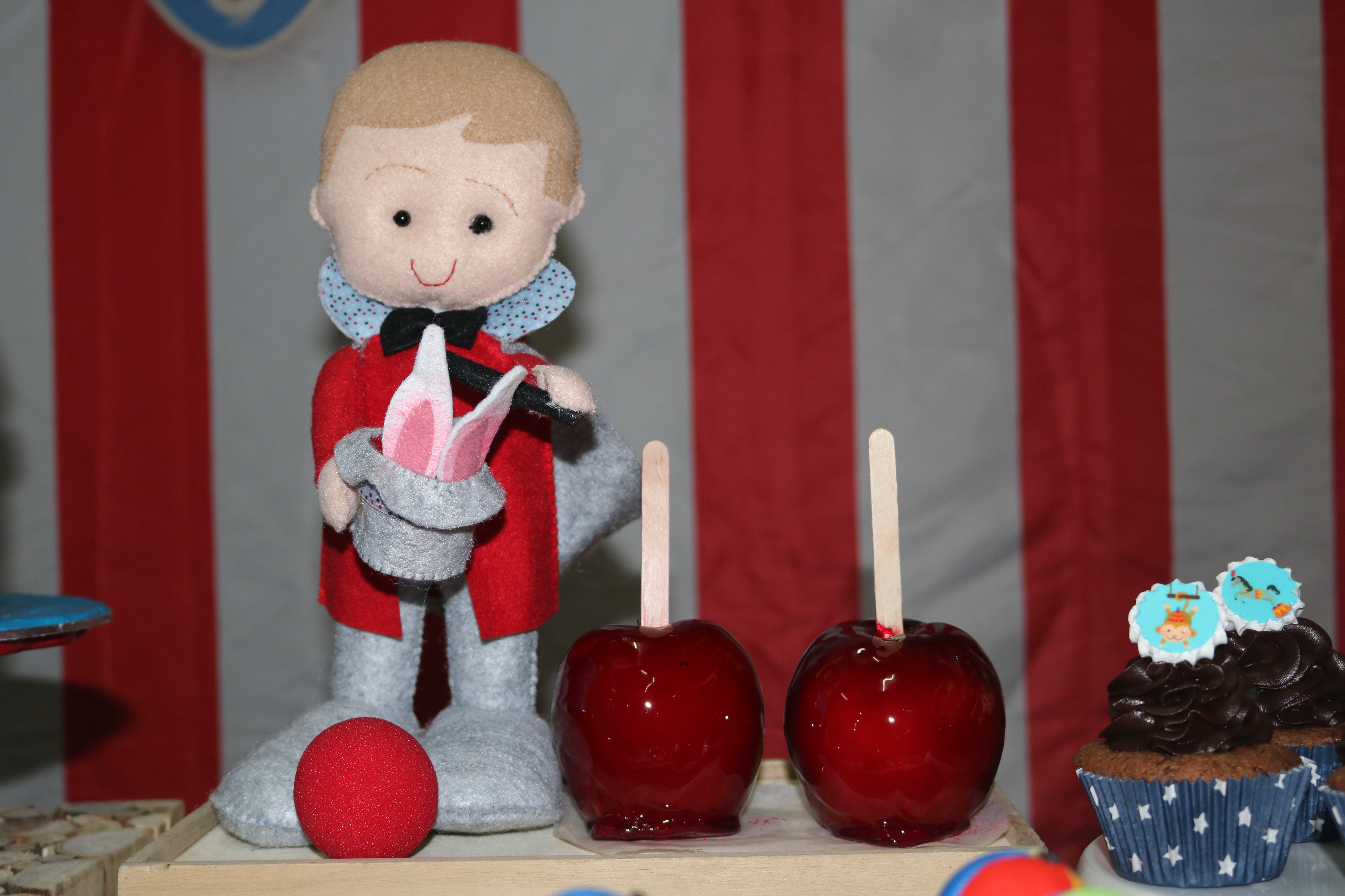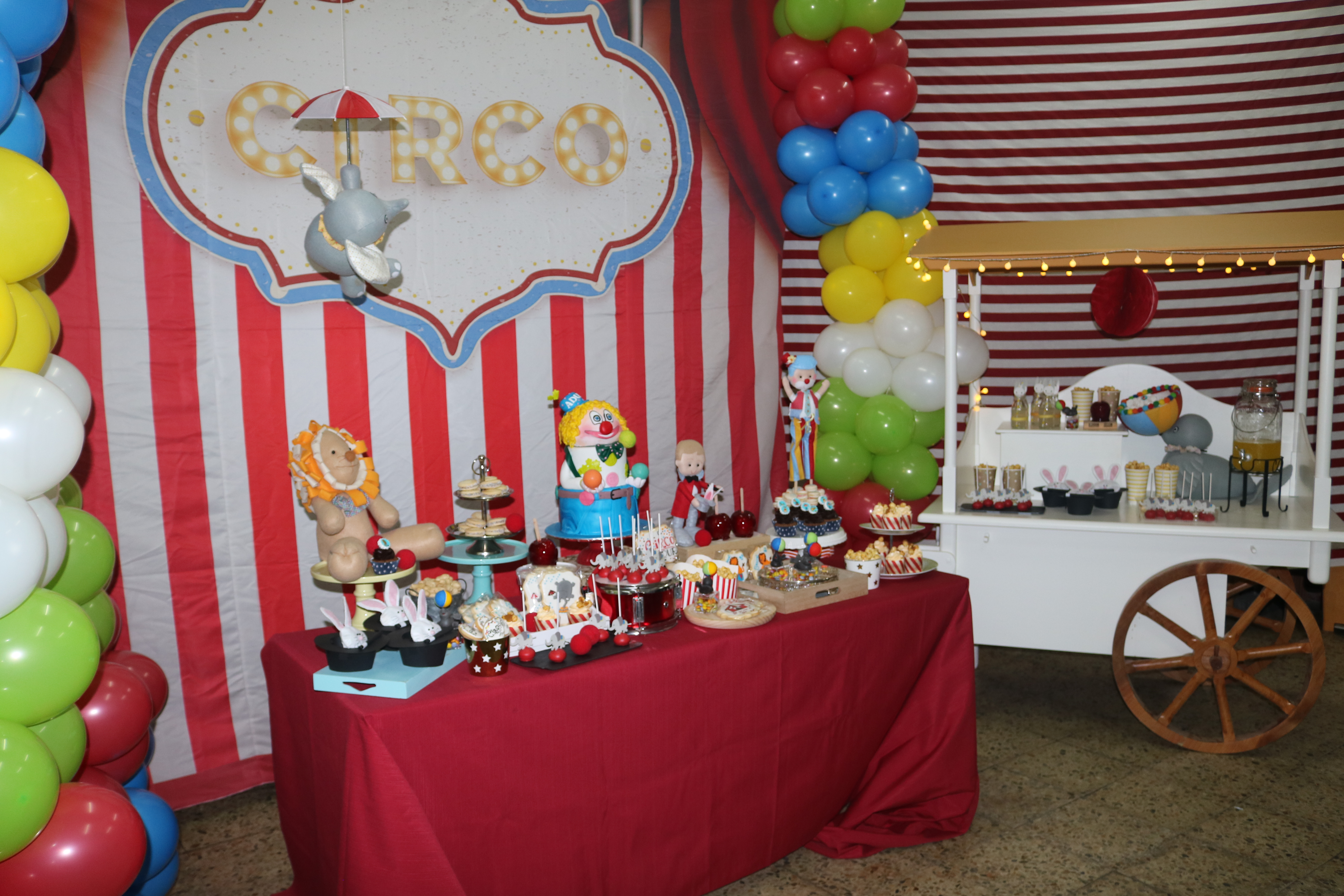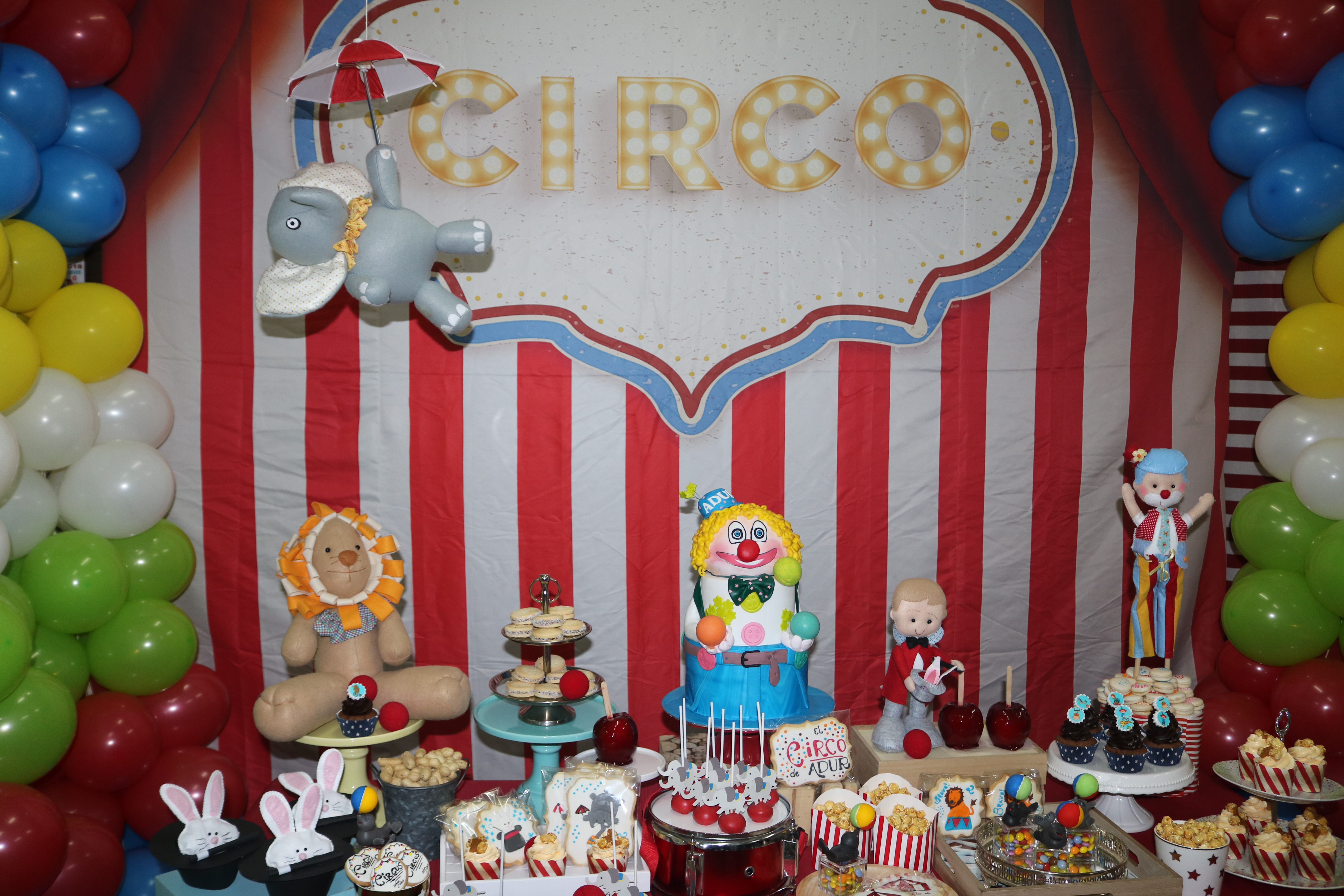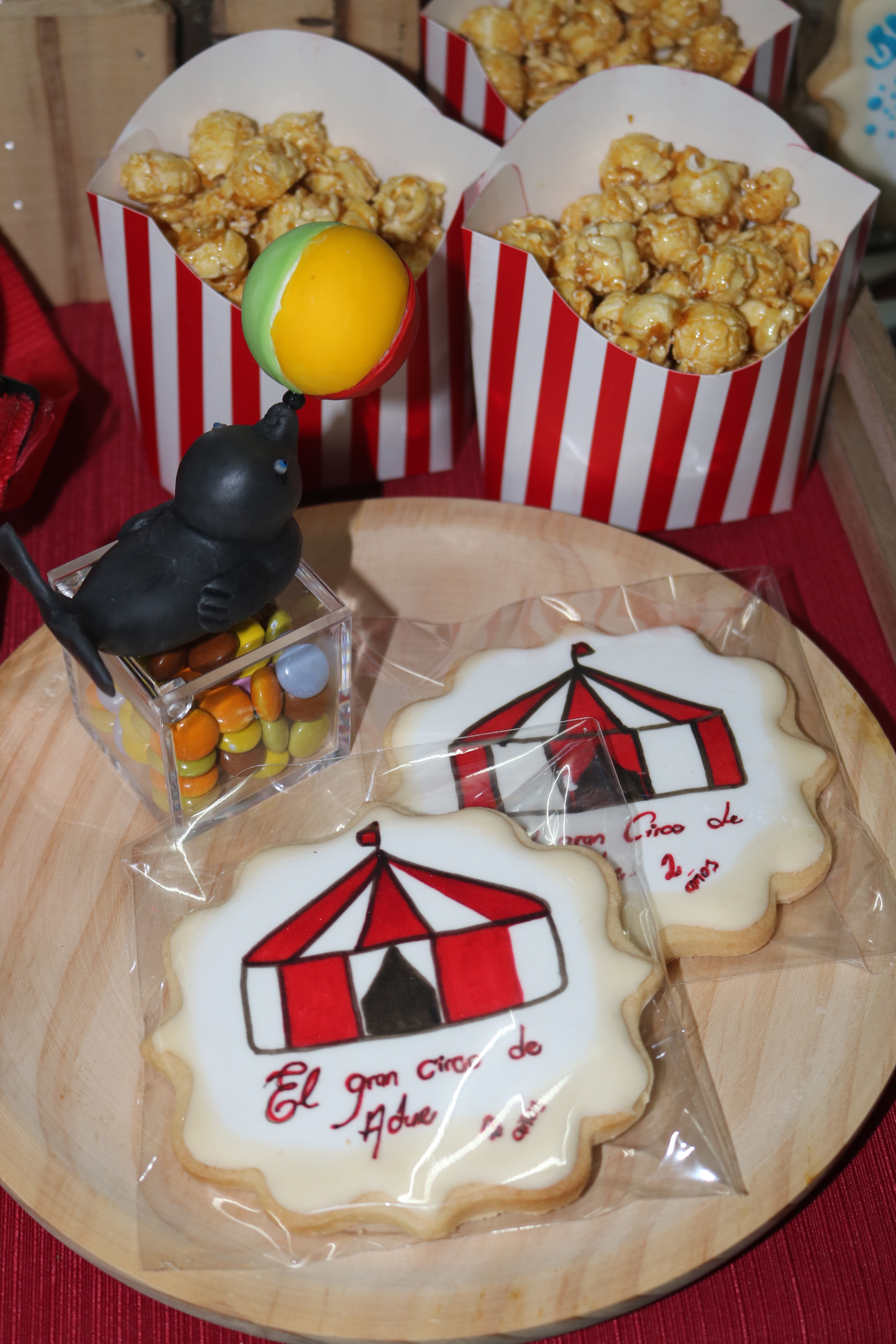 Por segunda vez el tema de circo, y me encanta. Una mesa muy divertida, con esos colores tan alegres, manzanas caramelizadas, cacahuetes, palomitas…