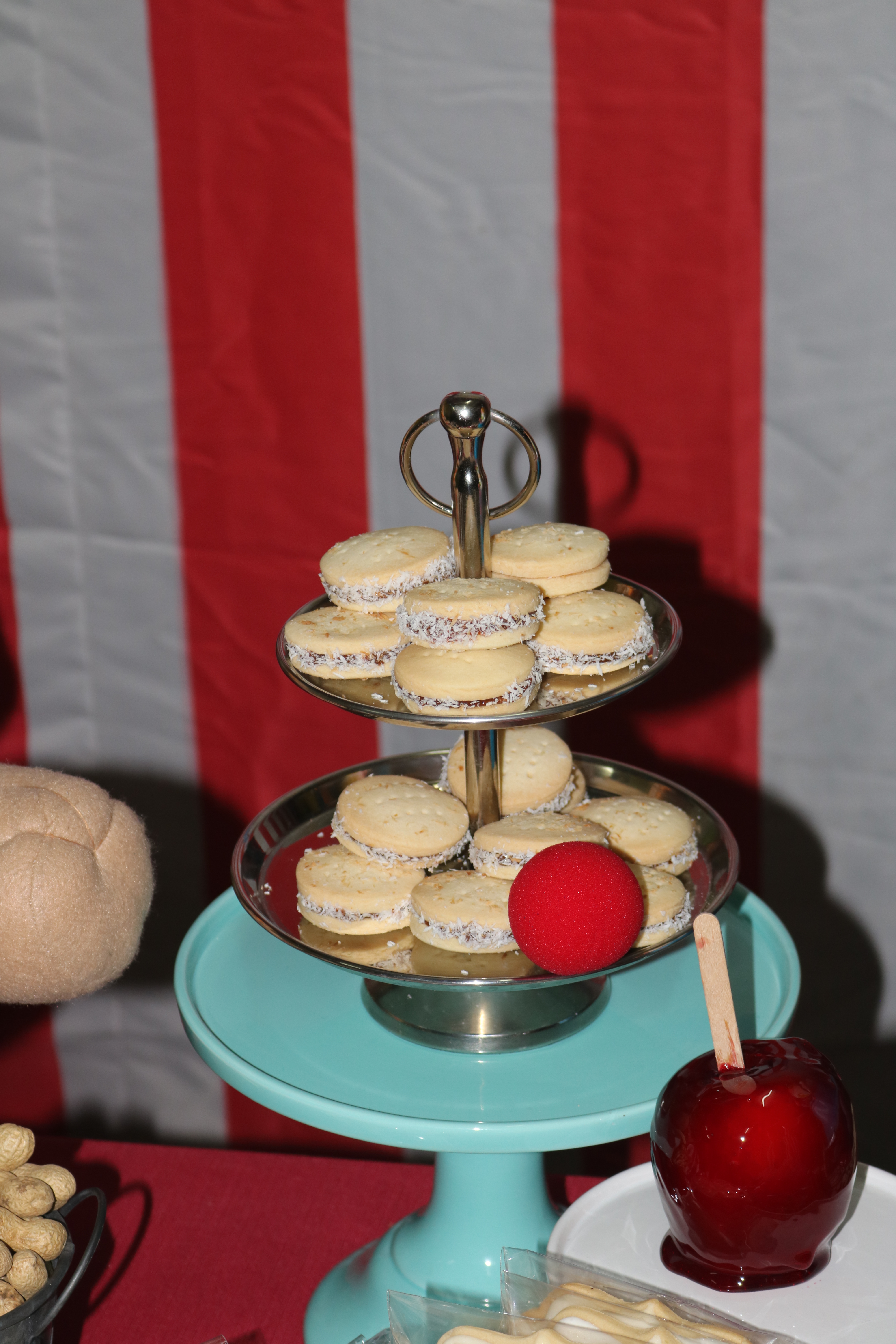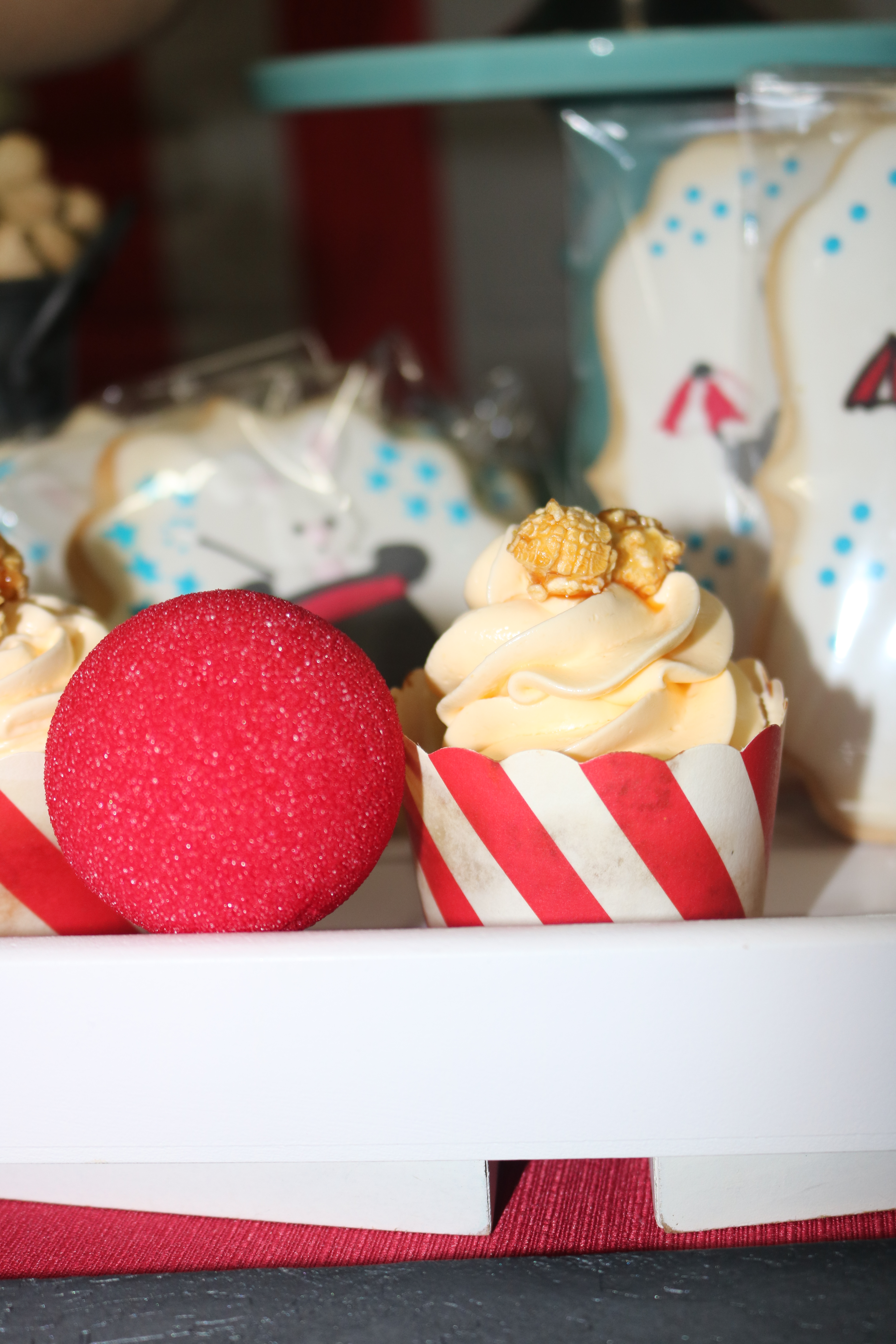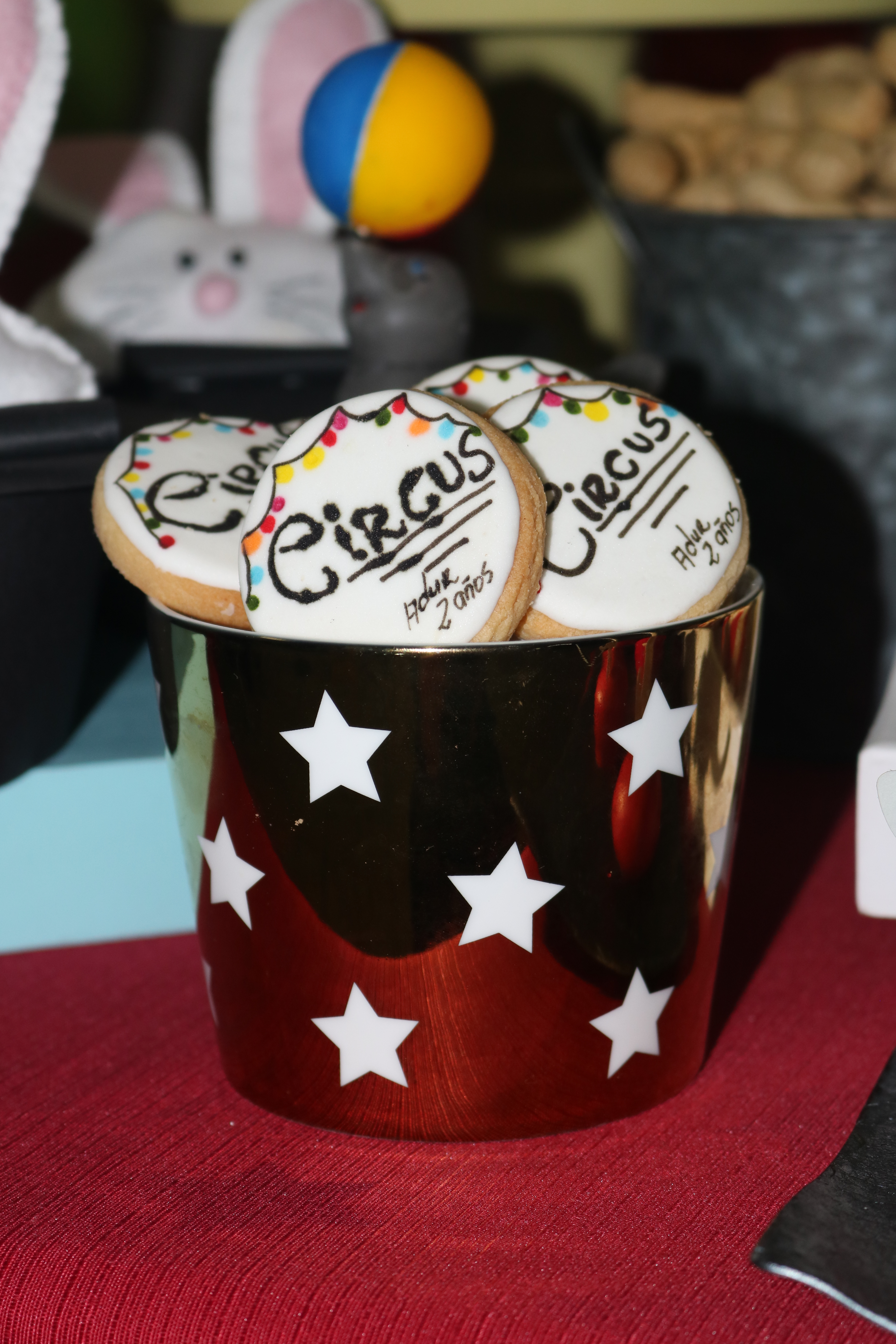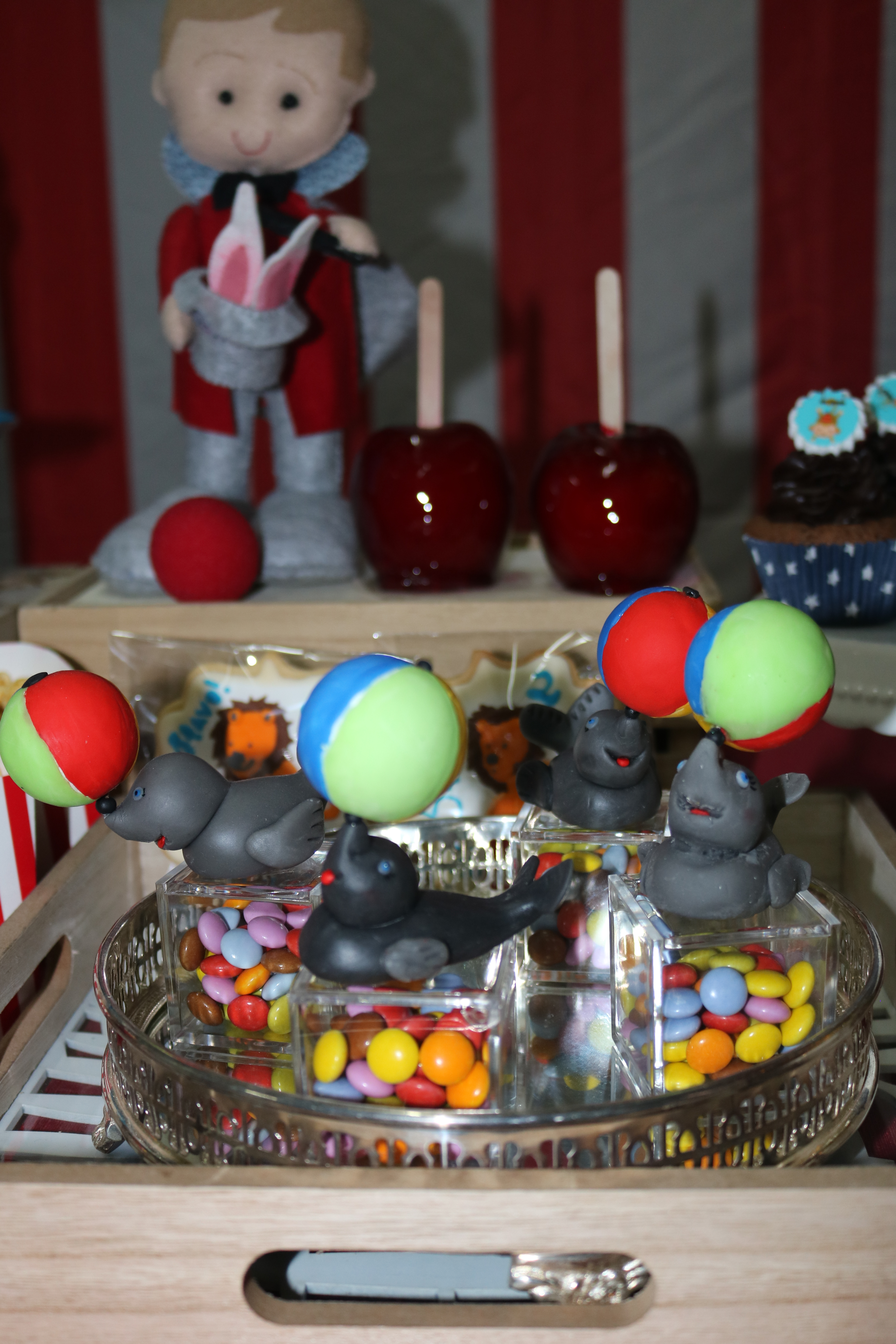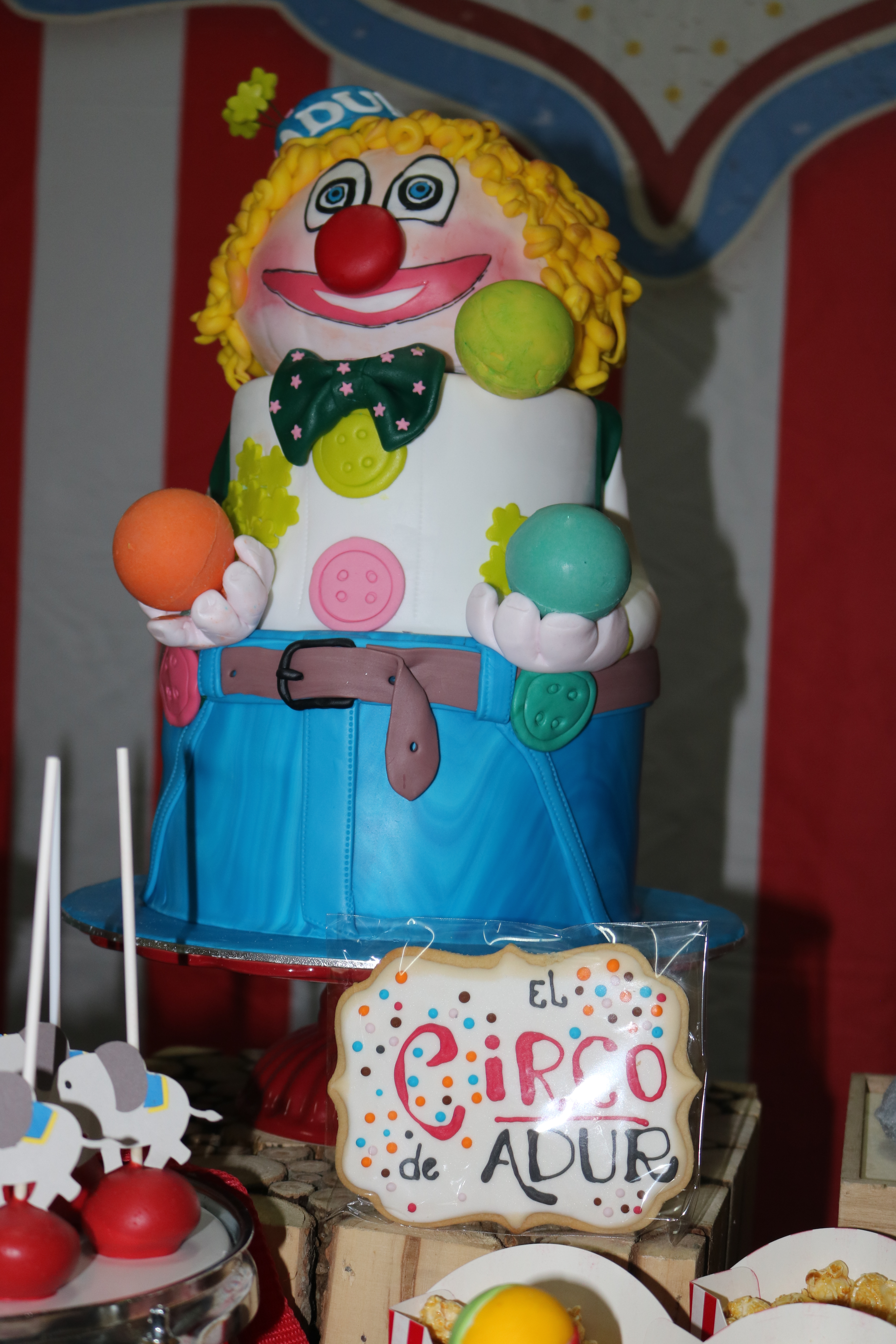 Por segunda vez el tema de circo, y me encanta. Una mesa muy divertida, con esos colores tan alegres, manzanas caramelizadas, cacahuetes, palomitas…
